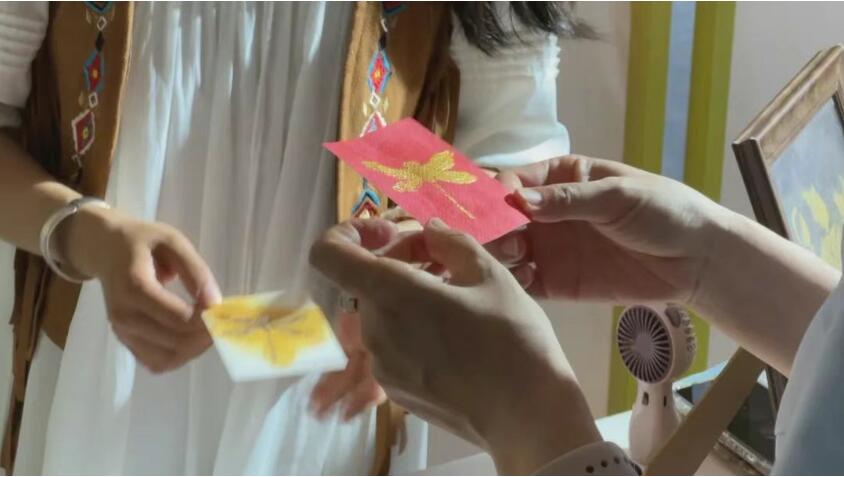在非物质文化遗产体验区,又是另一番热闹的景象。傣族金水漏印,这门以金水为墨、以漏印为法的古老技艺,在工作人员的演示下格外有灵气。市民们纷纷跃跃欲试,现场跟学。将素色纸张平整铺在竹垫上,再用软刷轻蘸金水,之后透过模板镂空一点点进行拓印,不一会儿,一只蜻蜓纹样就活灵活现地出现了。赵女士开心地说:“这些具有傣族风格的花纹还挺有意思,用金水拓出来非常漂亮,大家可以来体验一下。”