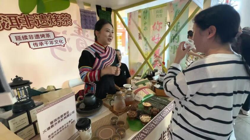 不远处的普洱茶制作技艺展示台前也围满了人,传承人手法娴熟地进行着杀青、揉捻等工序,刚冲泡好的普洱茶在白瓷杯里漾着淡褐的颜色,现场市民闻着茶香前来品尝。非遗烤茶传承人徐燕婷说:“非常感谢这次机会能让我们大山深处的烤茶非遗文化走进热闹的城市,让很多朋友知道在我们少数民族地区这种传统的喝茶方法,他们非常好奇,也很感兴趣。”