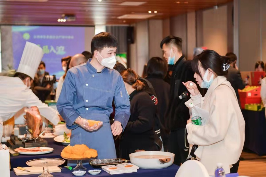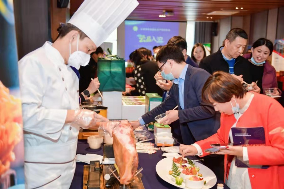 受邀嘉宾与企业代表首先参观“云品·上海选品中心”,包括云南省名特优农林产品展示中心暨普陀区对口帮扶地区农产品展示中心、上海市消费扶贫生活馆,宣威浦记火腿、南涧县红云核桃、云南食用野生菌等特殊产品琳琅满目,云南新鲜金耳菌、西双版纳土鸡汤等美食佳肴现做现尝。